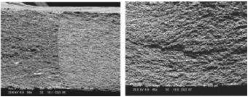 La figura 7 presenta dos imágenes provenientes de la observación en el microscopio electrónico de barrido de la superficie de dos probetas con cordón de soldadura que han experimentado procesos de fractura luego del ensayo de mecánica de fractura. En la imagen del lado izquierdo se distinguen las dos zonas típicas de una fractura por fatiga con una topografía más accidentada y rugosa en su sección izquierda y más lisa en la sección derecha. Por otro lado en la figura del lado derecho se puede percibir la evidencia del sentido de crecimiento que tuvo la grieta de izquierda a derecha y abriéndose lateralmente.