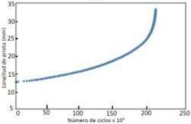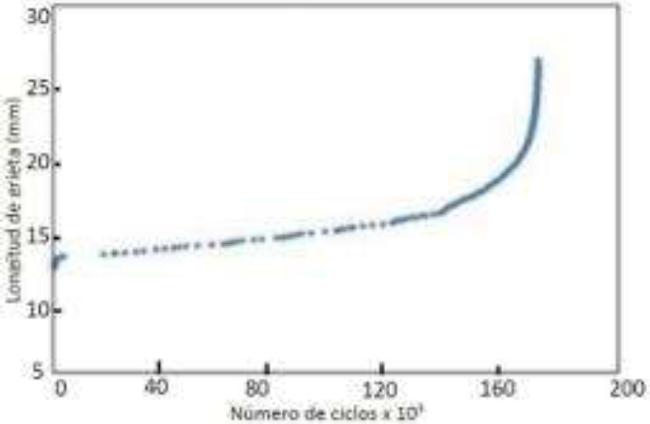 Las gráficas mostradas en las figuras 8 y 9, ilustran las curvas de longitud de grieta en función del número de ciclos en fatiga (N), para las muestras ensayadas sin soldadura y con cordón de soldadura respectivamente, ambas obtenidas de los datos provenientes de los ensayos de mecánica de fractura realizados. Conviene destacar que en el caso de las probetas sin soldadura los valores de tamaño de grieta son mayores, (cercanos a 35 mm) respecto a los que se muestran en el caso de las piezas con cordón de soldadura. Una explicación al respecto se puede encontrar en la interpretación de las curvas de las figuras 10 y 11.