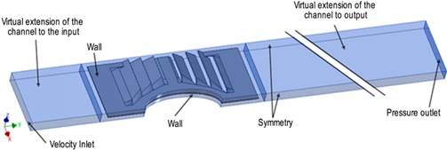 The need to have a uniform and one-dimensional velocity profile at the entrance of the model, as well as to avoid the existence of reverse flow in the exit section, is the reason for these extensions [8]. The fin in the central region of the domain is taken as a solid, while the channels above and below it is considered as fluid regions. Two boundary conditions are needed, the temperature in the tube and the parameters of the fluid at the channel inlet. The velocity inletwill be varied to study a range of Reynolds number. The boundary conditions for each surface are summarized below: