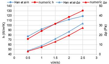 In figure 3 it is observed that for the values of Δp there are a good match, although the numerical model underestimates slightly this parameter. The behavior of the heat transfer coefficient is also quite approximated by the numerical model. The difference between the behaviors of these curves can be producedbecausethe geometry construction shown in the work of Han et al [10] is not realistic.It doesn’treproduces all details of the model nor the correct shape. The h-curve of this work overestimates for speeds above 1.5m/s while underestimating h for speeds below 1,5 m/s when compared to those of Han et al. [9]. From this comparison it can be stated that the method, the simplifications, as well as the boundary conditions used in this work are enough to achieve the proposed objectives.