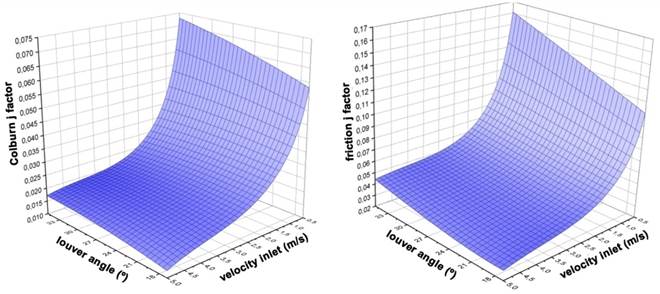 Figure 4 shows the values of the Colburn factor (j) and the friction factor (f) as a function of the velocity inlet into the model and the louver angle of the louvered fin.
