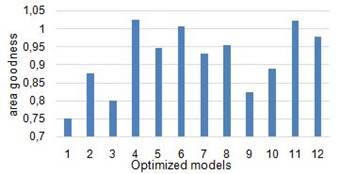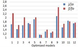 It is a known fact that louvered fins have a higher heat transfer than plate fins (reference fin). Figure 6 shown, that all optimized models have a j/jo coefficient higher than one. This increase however comes coupled with an increase in pressure drop, which generally is some percentages higher than the percentages of the heat transfer increase. In this work as the result of optimization there were three models obtained, which met the goal of increasing the heat transfer without a significant increase in pressure drop. In figure 7 it is shown that the models 4, 6 and 11 have area goodness values higher than one. It seems like the models with approximately 21° of louver inclination and velocities higher than 4,3 m/sare between the most effectives, according to the performance enhancement criteria.