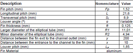 The numerical model used in this paper need to be certified before it could be applied for research. The method used here to certificate the model was to build a computational model with similar dimensions and characteristics that a geometry which had already been researched and its results are available in the literature. A geometry studied by Han et al[9] was selected, which wasvalidate using experimental results by Wang et al[10]. Han et al[9] state that the average deviations of the friction factor (f) and the Colburn factor (j) between their numerical model and Wang et al' results are 9,3 % and 4,5 % respectively. The experiments of the authors were based on a similar geometry of louvered fin with elliptical tube but using louver surrounding the tube. Another difference is that the inlet air to the wind tunnel has a temperature of 308 K and the wall temperature of the tubes is 353 K. The same flow regime, interpolation procedures, boundary conditions and convergence criteria were used. The coupling pressure-velocity is implemented using the SIMPLEC algorithm.