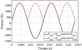 La onda sinusoidal se amplifica al introducirse el parámetro amplitud (Q), volviendo a alcanzar valores negativos; tanto mayores, cuanto lo sea el valor del parámetro amplitud.Además, la ecuación 3 desfasa el cruce por cero en dependencia del valor de Qmin , figura 2.