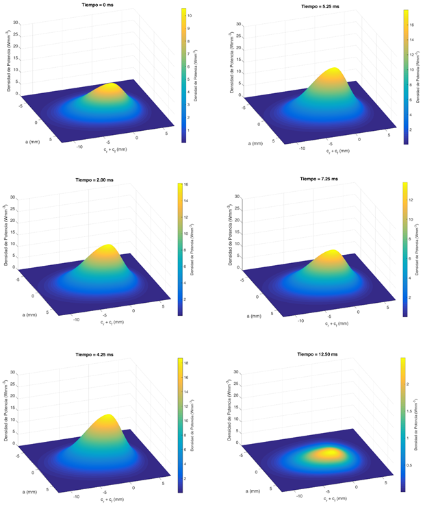 Para simular el ciclo de soldadura CMT, se considera el tiempo necesario para completar un ciclo o el período (T) de la onda de recorrido del electrodo de 0,01250 s.La variación de la densidad de potencia se simula entre 0 y 0,0125 s. Se obtiene una secuencia de gráficos superficiales en un dominio rectangular, figura 6.