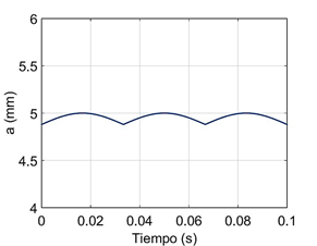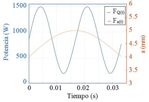 La ecuación (Fa(t) ), que describe el comportamiento del límite de fusión o semiancho del cordón (a), puede expresarse (ecuación 6), a diferencia de la ecuación de la energía, con un núcleo modular en la sección sinusoidal, pero con el valor de la amplitud dada por la media entre los valores máximos (amáx ) y mínimos (amín ) de la oscilación del semiancho del cordón (a).