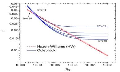 Figure 1 shows the difference between equations and considering different values for the diameters(such a range of diameters will be employed in the results section). Analyzing the figure, one can conclude thatthe calculation of the head losses using the HW is only accurate for a limited range of Reynolds numbers; even though, it is quite common to find several published articles that adopt the HW.