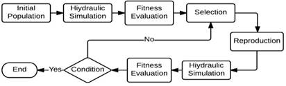 Finally, it is necessary to couple the hydraulic and optimization models asillustrated inthe below flowchart, figure 2. The first step is to generate a random initial population with the diameters of the pipe networkas variables. With the diameter vector, the hydraulic simulation is performedto calculate the flow rates inthe pipes and loads in the nodes. Then, the fitness function is evaluated,and the constraintsare verified, penalizing only individuals that violate the constraints (infeasible solutions). Afterwards, selection of the induviduals for reproduction occurs to generate a new population. This process of selection, reproduction and fitness evaluationis repeated until the maximum number of generations is reached.