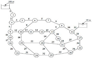 The pipe network analyzed inthis workis called Two-Source, and it is consisted of 34 pipes, 26 nodes and two water reservoirswith elevations(altitutes) of 95 and 100 m asdepicted in figure 3. The HW coeficient is set to 130 and the associated roughness in the Colebrook correlation is assumed to be 0.25mm or 0.50mm considering cast iron [21]. Nodal demands, minimun nodal heads () andpipe lengthsare presented in table 1,while diameters with associated costs to be considered in the network design arein table 2.