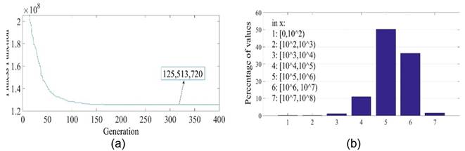 This occurs because in the optimization process, the Reynolds number varies from to as depicted in figure 4-b for the HW correlation, figure 4-a shows the evolution of the fitness function to the best value found. Hence, once the HW correlation is accurate only to a specific range of Reynolds number as shown in figure 1, its use in conjunction with the GA generates individuals with small errors in the hydraulic results that propagate during the GA generations.