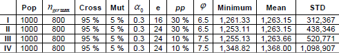 Finally, a statistical analysisis also performed, considering 11 independent runs of the GA and based on four sets of parameters as shown in table 3. These sets are classified as follows: (I) standard set of parameters, (II) set of parameters that resulted in the lowest found fitness function using the HW correlation, (III) set of parameters that presented a lower meanin the sensitivity analysis and with the use of the HW correlation, and (IV) same parameters adopted in (III) but with the Colebrook correlation.The minimum cost of the network, mean (both in thousands) and standard deviation (STD) are also presented in this table, whereas the optimum commercial diametersfor these four sets are displayed in table 4.