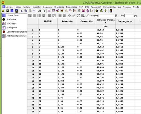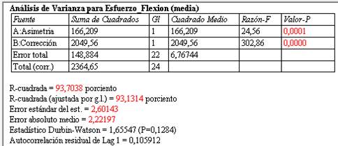En la tabla 3 se observan los valores de la Razón-F de asimetría y corrección, que es la estadística de la prueba usada para determinar si el término está asociado con la respuesta. Un valor de la Razón-F suficientemente grande indica que el término o el modelo es significativo. Estos valores fueron determinados con el diseño factorial completo con el software Statgraphics Centurion. Se observa que la variable corrección tiene el valor más alto, por consiguiente, es la que más influencia tiene en el esfuerzo a flexión en el pie del diente.