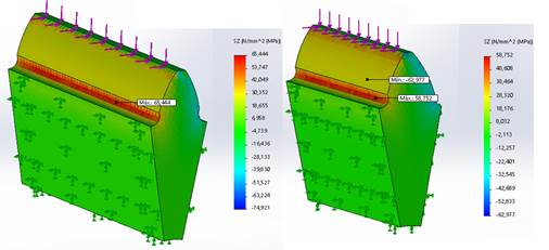 En la figura 4 se muestra como varían las tensiones normales en el eje z (σz) en MPa a lo largo del diente con un ángulo del perfil de 20 grados y con corrección X = 0,50 (a) y con coeficiente de asimetría de 1,35 y corrección X = 0,50 (b)