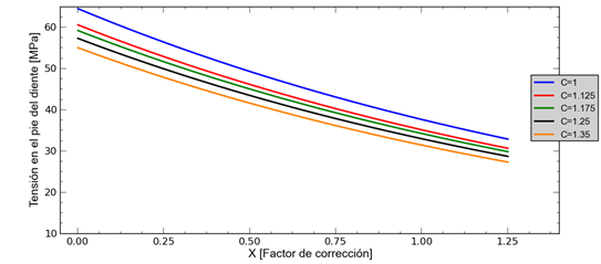 Dichos factores geométricos influyen significativamente en el esfuerzo a flexión en el pie del diente, se verifica que estos esfuerzos disminuyen conforme aumenta la asimetría y corrección, para engranajes cilíndricos de dientes rectos asimétricos exteriores. Para un diente de engranaje recto con corrección X = 0; asimetría C = 1; el valor de tensión normal obtenido es de 63,02 MPa. En tanto que el mismo diente y en las mismas condiciones, pero considerando la variación de los factores geométricos corrección x = 1,25; asimetría C = 1,35; el valor de la tensión normal es de 32,22 MPa. Habiendo una reducción del valor del esfuerzo en un 48,87 %.