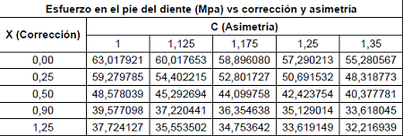 En la tabla 4, se muestran los valores de las tensiones normales (MPa), en el pie del diente. Estos valores fueron determinados mediante la aplicación del MEF, considerando el modelado CAD de los dientes rectos cilíndricos exteriores; lo que permite obtener una serie de valores de tensiones normales en el pie del diente para evaluar la influencia de los factores geométricos corrección y asimetría