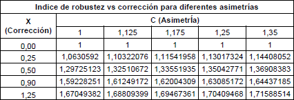 De los cálculos obtenidos y con la ecuación formulada se construye la Tabla 7 que muestra los valores del índice de robustez a flexión en el pie del diente para dientes asimétricos rectos exteriores para combinaciones de asimetría y corrección. Estos resultados ratifican la influencia de los parámetros geométricos en la robustez del diente, y en particular de la combinación de asimetría y corrección.