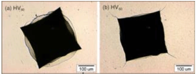 En el primer caso la grieta atraviesa la impresión de indentación mientras en el segundo caso ella se restringe a la continuación de las aristas de impresión. De acuerdo con el tipo de grieta fue desarrollada una ecuación para el cálculo de la tenacidad.