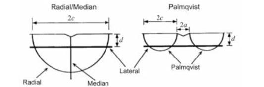 Al observar las huellas y la grieta formada, permite identificar el tipo de grieta y realizar las mediciones de longitud de esta con la ayuda del ocular graduado del microdurómetro, como se ilustra en la figura 2, para las grietas de tipo Radial (Median Crack) y las grietas tipo (Palmqvist Crack).