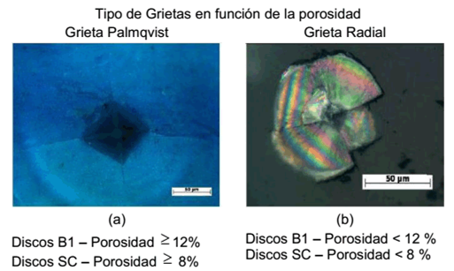 En la aplicación del método de indentación en la fase inicial del estudio de este parámetro se evaluó la formación de la grieta para cargas entre 50 y 300 g, apareciendo la grieta con la carga de 200 g (1,96 N) durante 15 segundos para todos los casos, realizándose 10 mediciones en cada disco. Se realizaron mediciones de la diagonal de la huella y longitud de la grieta con el micrómetro ocular del microdurómetro. Se observó que en los discos B1 el cambio de grietas Palmqvist para radial, Figura 1, ocurrió a partir de 12% de porosidad aparente (PA), mientras que en los discos SC ocurrió a partir de 8%, lo cual expresa que la formación de la grieta depende de la porosidad y cambia para cada condición del material.
