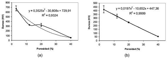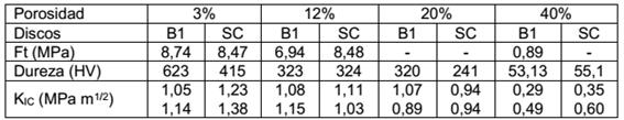 Ambos materiales se comportan de acuerdo con la literatura donde la dureza, tenacidad a la fractura y resistencia a la compresión diametral disminuyen con el aumento de la porosidad.