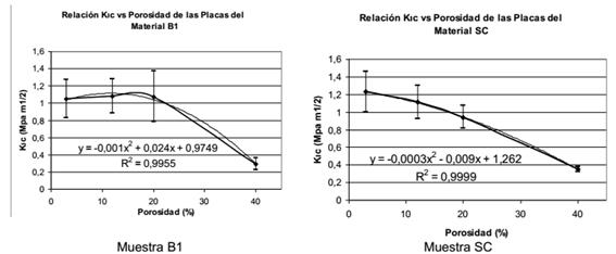 En la figura 6, son presentadas las curvas de KIC obtenidas a partir de las ecuaciones 1 y 2. También en este caso se observa un comportamiento no lineal para la muestra B1, donde la tenacidad es aproximadamente constante hasta 20% de porosidad y para valores mayores sigue un comportamiento semejante a la muestra SC. Y se muestran los valores de KIC determinados para las muestras B1 y SC con diferentes porosidades.