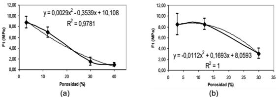 En la figura 8, se observa la relación entre la resistencia a la compresión y porosidad para las dos muestras. Los puntos fueron obtenidos a partir de la Ecuación 4 y representan el valor medio de los ensayos de compresión diametral. Fueron medidos cinco discos para cada valor de porosidad. Se nota que la muestra SC, de un modo general, presenta valores de resistencia a la compresión superiores a la muestra B1.