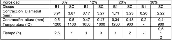 Llegando a un consenso con los resultados podemos decir que el material SC tiene un comportamiento similar al de los discos B1 a todo lo largo del rango de porosidades. La evaluación del tamaño y volumen de los poros en estos, mediante la Porosimetría de Mercurio, entre las porosidades del 12 % y el 20 % existe poca diferencia en los volúmenes de poros. Por lo que, si llevamos esto a comparación con las propiedades mecánicas de estas porosidades, obviando la resistencia a la compresión diametral, podemos decir que las demás características mecánicas como la Dureza y el KIC presentan también poca diferencia, siendo muy similares para ambos materiales. En general las propiedades evaluadas decrecen bruscamente a partir del 20 % de PA. La forma de ruptura y los valores de resistencia a la compresión diametral se comportaron diferente entre los discos más densos (hasta el 12 %) con respecto a las de mayor porosidad, lo que debe ser correspondido por el mayor volumen de poros que actúan en la propagación de la grieta dando una mayor fragilidad en el material. El estudio de la contracción y la influencia de la temperatura, así como el tiempo sobre la porosidad de los discos se llega a la Tabla 3.