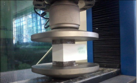 El ensayo de compresión se realizó conforme a la NBR 13279. La velocidad de aplicación de la carga fue de 500 N/s. Los platos del dispositivo utilizado son los que trae la máquina para el ensayo de compresión y que se encuentran en concordancia con lo propuesto en la norma como se muestra en la figura 4.