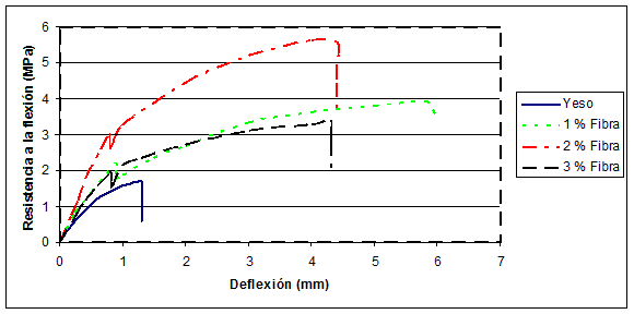 En el caso de las deformaciones el yeso puro presenta las menores deflexiones en el momento de la rotura. Sin embargo, al analizar los materiales compuestos estos presentan un aumento considerable en las deflexiones, siendo el compuesto con 1 % de fibra el que mayor valor alcanza, produciéndose una caída en estos valores al aumentar los porcientos de fibra.