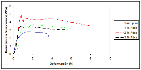 Como se puede apreciar la curva correspondiente al yeso puro tiene la misma forma de los materiales con comportamiento frágil. Sin embargo las curvas de los materiales compuestos son similares a las correspondientes a materiales de comportamiento dúctil.