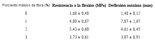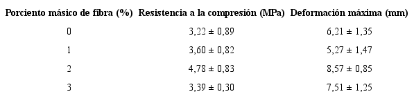 De forma general, al comparar los resultados obtenidos con los reportados en la literatura se puede apreciar que la resistencia a la flexión (Rf) del compuesto con 2 % de fibra de caña de azúcar, que es de 5,43 MPa, está por encima del máximo reportado, que corresponde al compuesto reforzado con cáscara de arroz y tiene una Rf de 3,7 MPa. Sin embargo, en el caso de la resistencia a la compresión (RC) del compuesto con 2 % de fibra de caña de azúcar, que es de 4,78 MPa, se encuentra dentro del rango reportado en la literatura, que va desde 1,47 MPa para el compuesto reforzado con poliestireno, hasta el compuesto reforzado con fibras de barchip, que tiene una RC de 8,8 MPa.