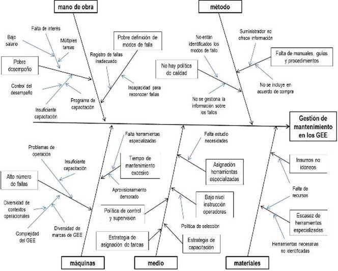La identificación y análisis de los factores causales permitió establecer como dimensiones a considerar: mano de obra, método, máquinas, medio ambiente y materiales. La Figura 2 presenta un diagrama causa-efecto (Ishikawa) que resume el análisis de los factores causales que impactan negativamente sobre la situación actual del mantenimiento a los GEE, agrupados por cada dimensión.
