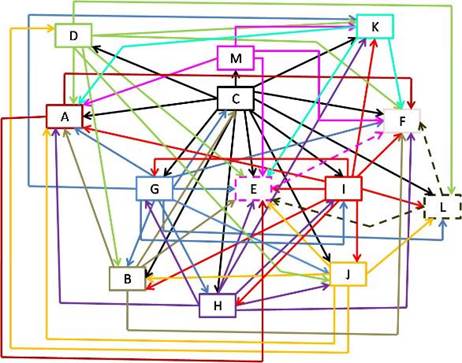 De manera preliminar a la elaboración del Inograf, se conformó el diagrama de relaciones de los elementos a incluir en éste. Dichos elementos constituyen los factores causales que impactan negativamente al mantenimiento de los GEE y el análisis de la intensidad de las relaciones que se establecen entre los mismos se recoge en la Tabla 3, donde se muestra el diagrama de relaciones, mientras que el Inograf se presenta en la figura 3.
