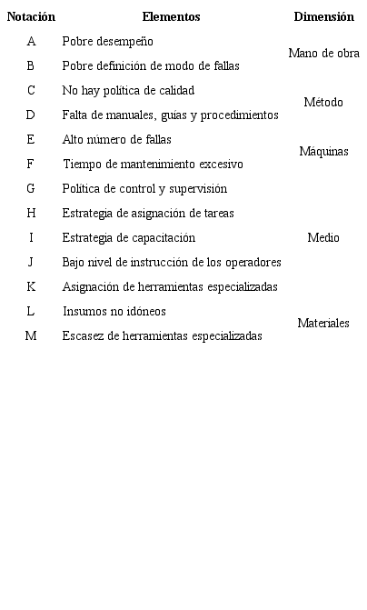 Con el fin de definir y jerarquizar los factores limitantes se aplica la herramienta Inograf. En la tabla 2 se presenta la leyenda de los elementos cuyas relaciones se estudian a través de esta herramienta, así como la dimensión a la que pertenece cada uno.