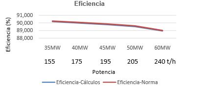 Al ser comparados gráficamente los resultados de los cálculos con las normas de explotación de la central, se evidencia que el error entre unos y otros valores aceptable, lo que demuestra que el programa creado a partir de la metodología del cálculo normativo de generadores de vapor funciona correctamente.