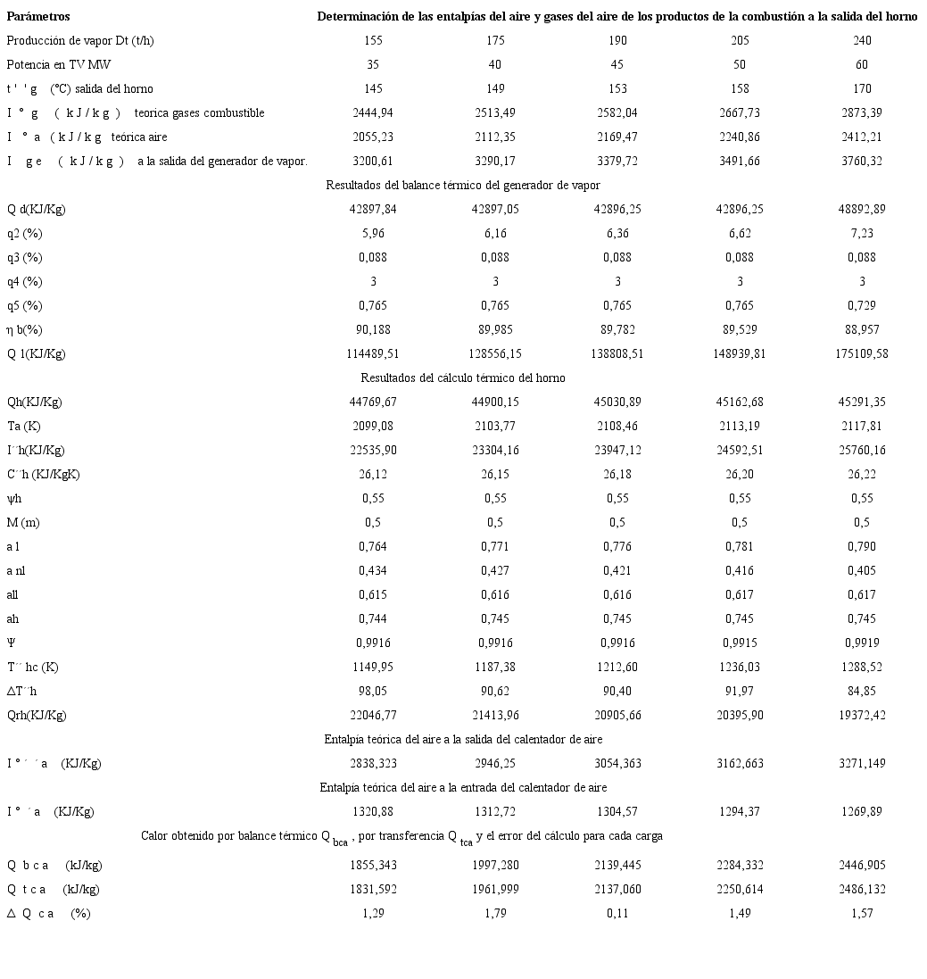 A continuación se muestran, em la tabla 1, los resultados de los cálculos realizados en Excel relativos al balance en el generador de vapor, con el cálculo previo de las entalpias en el horno, el cálculo térmico del horno y del calentador de aire para cada carga o régimen de trabajo de la central.