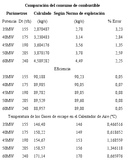 La comparación de los resultados del cálculo con los valores de la norma de explotación y el error calculado para el consumo de combustible, la eficiencia del generador de vapor y la temperatura de salida de los gases de escape del calentador de aire, para cada uno de los regímenes analizados se muestran en la tabla 2 y en las figuras 2, 3 y 4,