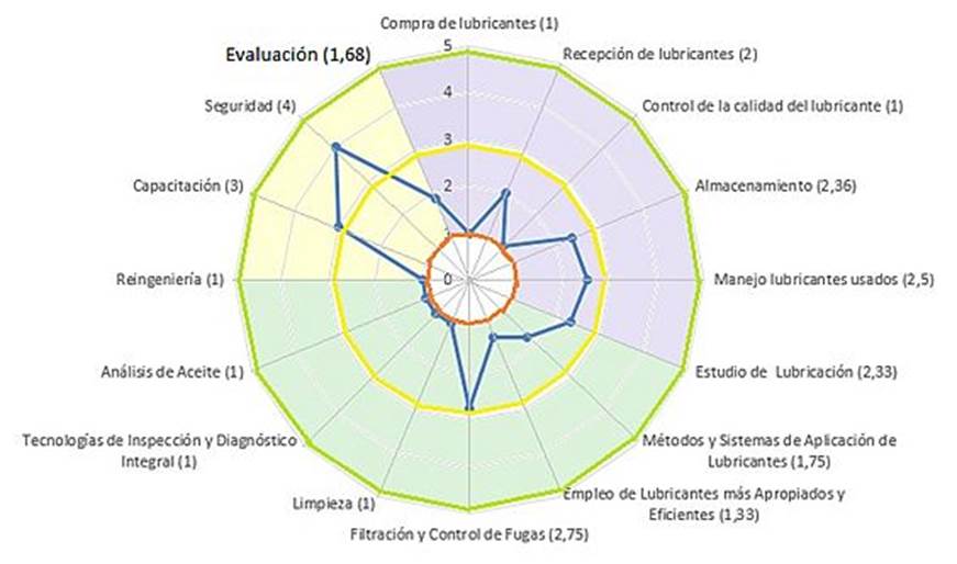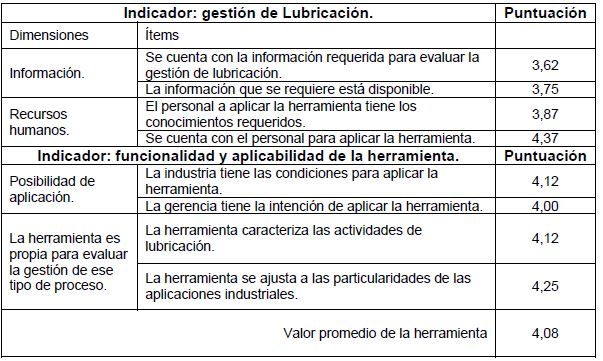 Cada indicador evalúa diferentes dimensiones e ítems los cuales van a permitir inferir el estado de la gestión de la lubricación y los lubricantes de manera que sea posible identificar las áreas de la industria de mayores potencialidades para mejorar y formular propuestas de acciones correctivas para disminuir el impacto de los problemas detectados. Los resultados se evaluaron utilizando método de Likert [9]. Los criterios valorativos de cada ítem se aprueban en el grupo evaluador que se conforma entre los técnicos de la organización o con estos y la colaboración de terceros. La evaluación final se obtiene promediando los valores obtenidos entre los ítems de cada dimensión, entre las dimensiones e indicadores.