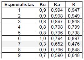 Los técnicos que obtienen el valor de K menor de 0,6 no se consideran expertos para el tema que se va investigar.