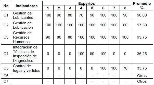 Para diseñar la herramienta de evaluación de la gestión de la lubricación y los lubricantes se reunió a un grupo 9 especialistas de la industria y la universidad. Mediante el análisis de expertos fueron obtenidos los resultados que se muestran en la tabla 1.