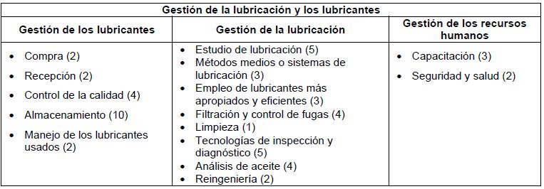 Como se puede observar en la tabla 3, la gestión de los lubricantes incluye la atención a las acciones de compra, recepción y control de la calidad del lubricante nuevo, para contribuir a que este cumpla con los requerimientos necesarios para la lubricación en el activo.