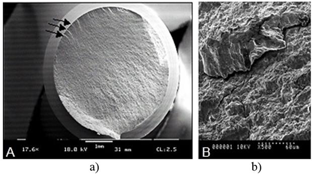 Para el análisis de la fractura se utilizó el perno que mejor mostraba una superficie de fractura con poco deterioro, figura 5. Este mostraba una superficie bien definida aunque presentaba unas pequeñas señales de óxido que no fueron eliminadas para poder preservar casi intacta la topografía de la superficie de fractura [5,6]. A modo de comparación en la figura 6a se muestra la fractura frágil, (sin señales de fatiga) de un perno de grúa que sufrió una fractura frágil, y en la figura 6b se muestra la información obtenida por microscopia electrónica de barrido MEB.