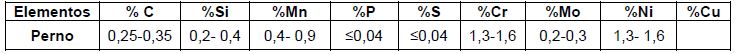 El análisis químico se realizó utilizando un espectrógrafo portátil modelo PMI Master Pro, de la firma Oxford Instruments de Alemania. Como Norma de referencia se tomó la DIN 34CrNIMo6 que es la que rige en Finlandia el país de origen del equipo, para el caso de elementos roscados de alta resistencia. En la tabla 1 se muestran los resultados del análisis químico espectral.