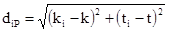 Donde diP es la distancia Euclidiana entre las coordenadas de los puntos Pi = (ki,ti) y P = (k,t), como se muestra en la ecuación 12[15].