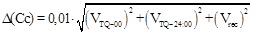 (5)Como la cantidad de combustible en los 4 tanques de 100 m3 y 8 tanques de servicio diarios de 2 m3, es un valor elevado en comparación con el combustible que se consume durante la operación de los GED, él Δ(Cc) es significativo e incide en que el error relativo δ(Cc) sea importante tal como se presenta en la ecuación 6: