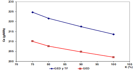 Estos resultados sugieren que el comportamiento del Ce depende principalmente de las Tai y Td. En la figura 2b se observa que en la medida en que la Tai y Td se incrementan, los Ce disminuyen al aumentar los K y consecuentemente la velocidad en rpm del MCI.