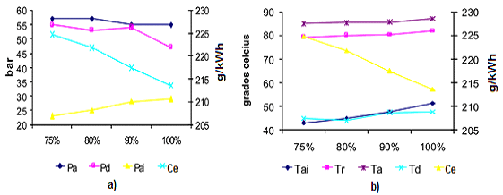 Inicialmente se obtuvo una representación gráfica de los valores de: Ta, Tai, Td, Tr, y Pa, Pai, Pd, y se calcularon los Ce: 224,7, 221,75, 217,48 y 213,63 g/kWh respectivamente.