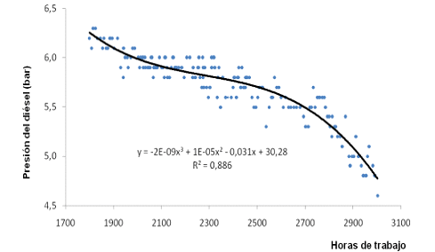 Se obtuvo la línea de tendencia que mejor se ajusta al comportamiento de Pd del filtro del GED analizado para un periodo de trabajo de 1800 h hasta 3107 h, o sea, 1287 h de trabajo diario. Se obtuvo un polinomio de tercer orden, y = - 2E-09x3+ 1E-05x2 - 0,0313x + 30,283, con un coeficiente de determinación, R2 = 0,886 (88,6 %), como se muestra en la figura 4. El rango de variación de Pd en el filtro de combustible es de 4,6 bar hasta 6,3 bar, y en promedio la Pd durante el tiempo de trabajo de filtro fue de 5,6 bar.