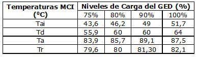 Se identificaron los valores máximos de las temperaturas del diésel, el lubricante, el aire utilizado en el proceso de combustión y el líquido refrigerante (ver la tabla 3) durante el experimento y se constató que todas se incrementan. El incremento de la Tr es 3,6 0C, de la Ta es de 2,5 0C, de las Tai y Td es de 8,1 0C respectivamente; y que la Td mantiene valor estable de 60 0C al 80 % y al 90 %. Además se observó que del 90 % al 100 % la Ta disminuye en 1,6 0C. Se considera que este comportamiento se deba al estado técnico del DEG.