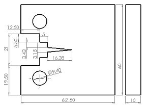 Para desarrollar la investigación se utiliza una probeta compacta, figura 1, de acero AISI 1018. Esta probeta se fabricó mediante la unión a tope de dos planchas de 10 mm de espesor y soldadura semiautomática. La forma geométrica de la probeta se definió acorde a la norma ASTM E 1820-01 “Standard Test Method for Measurement of Fracture Toughness”. El modelo geométrico fue elaborado en el software SolidWorks, mientras que las simulaciones se realizan con el complemento Simulation, que tiene incorporado el primero.
